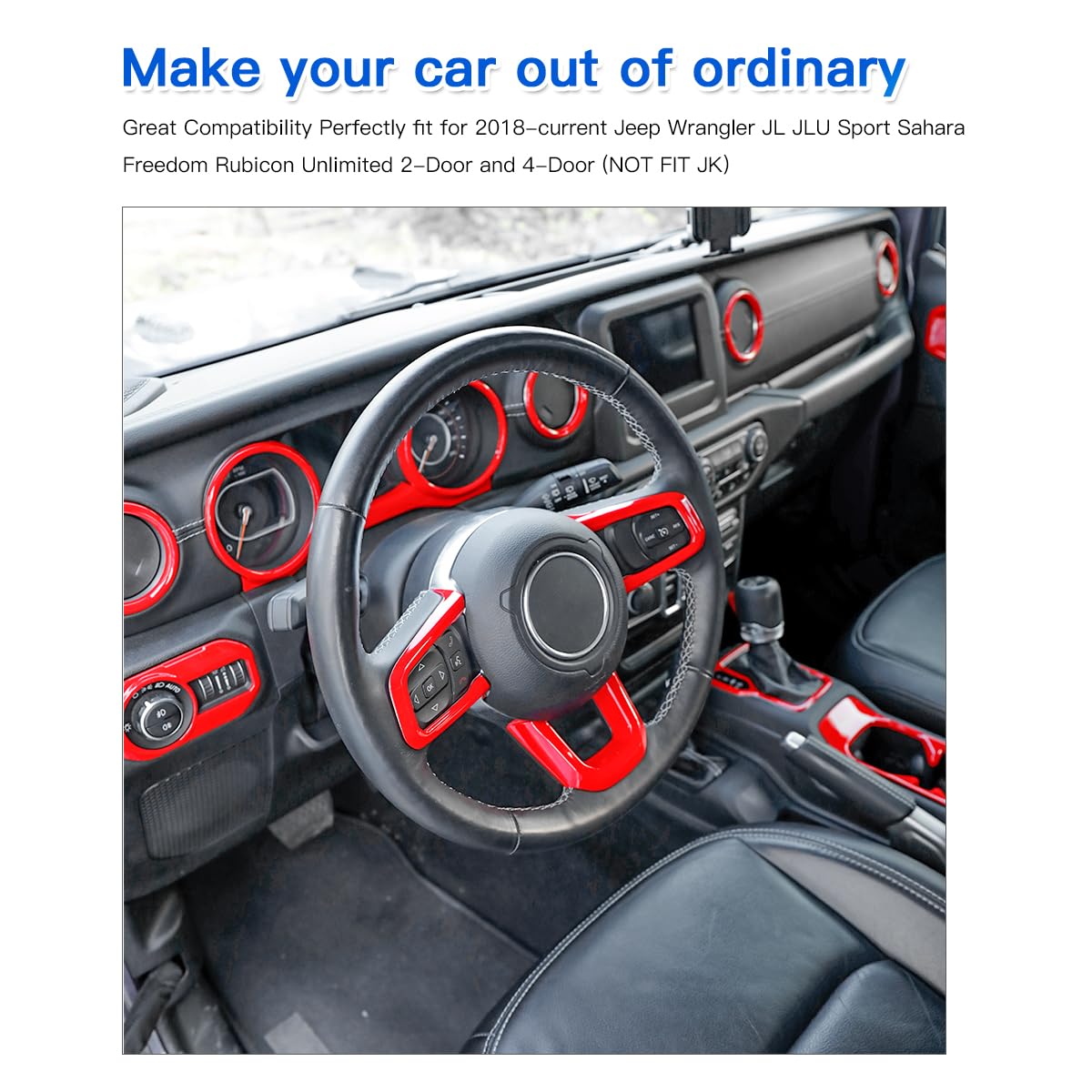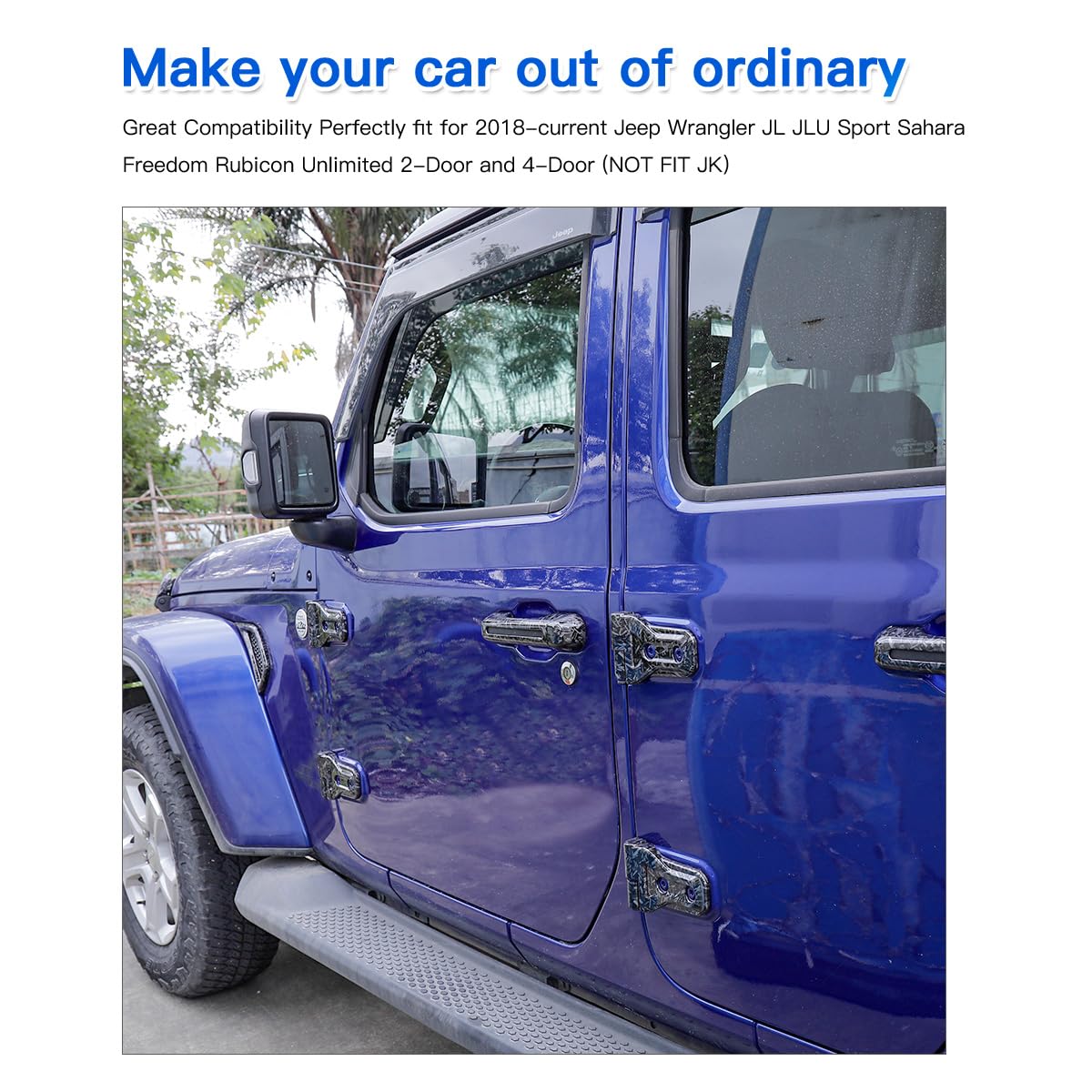 Description :Compatible Model: Compatible with Jeep Wrangler JL JLU Sport Sahara Freedom Rubicon Unlimited &Gladiator JT 2-Door and 4-Door 2018 2019 2020 2021 2022 2023 2024 2025Material: Made of high quality ABS plastic ,Three-layer processing:Background paint, pattern paint,Transparent UV in great finished.Installation:Veay Easy with Double-sided adhesive tape ,first pls cleaning surface with alcohol,pour the alcohol over the cloth and wipe it with the cloth, will not damage the original car,second heat the tape by a hair dryer for better adhesion,last press it almost 1 minute. (3 Step)Very easy to remove: Pull item by one side, heat the tape by a hair dryer,Slowly wait the tape Stretch, than easy remove by hand.Attention:Please check careful your Car Model and Year before your order. If you have any questions about fit ,model or installation or other , please let me know, if you are not satisfied with this item. We will reply to you with in 24 hours.